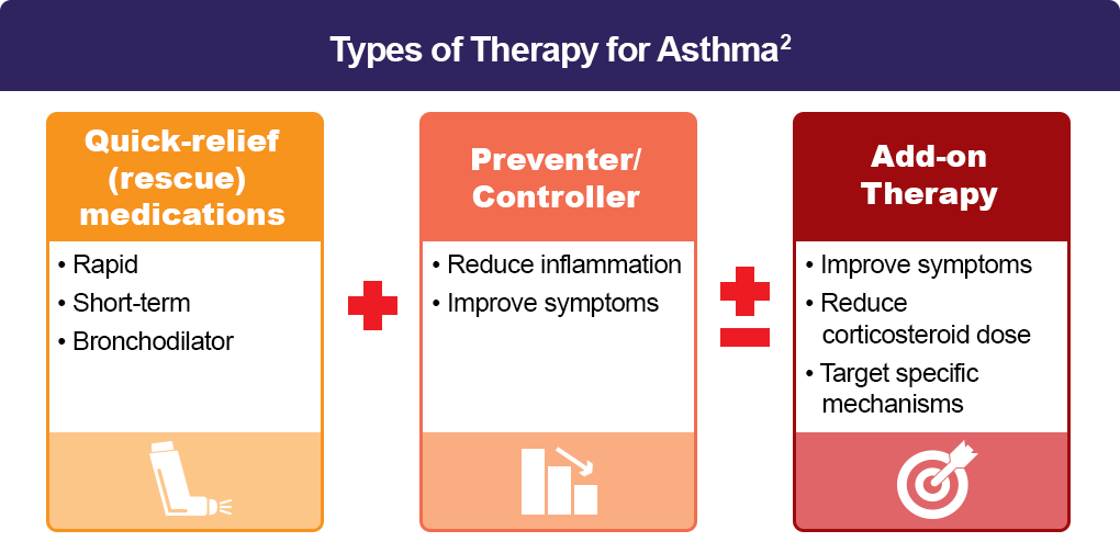 There are a number of different types of medication that can be used to help you control your asthma symptoms. You can think of them in how they are used: reliever, preventer/controller, and add-on therapy.